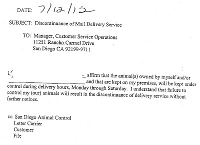 Note: How and why this all happened is a mystery. Our mailbox is outside the Compound for just this reason. The carrier was a substitute and was delivering a package. She decided to open the gate and walk into the Compound to leave it at our door. The Guards barked and she freaked out. As far as I can tell, she was a desk jockey for the Post Office who was pressed into service because of the layoffs. She was unused to dogs and just came unglued. When she got back to the office, she had our mail delivery turned off. I had to go in and sign this form to get it turned back on.